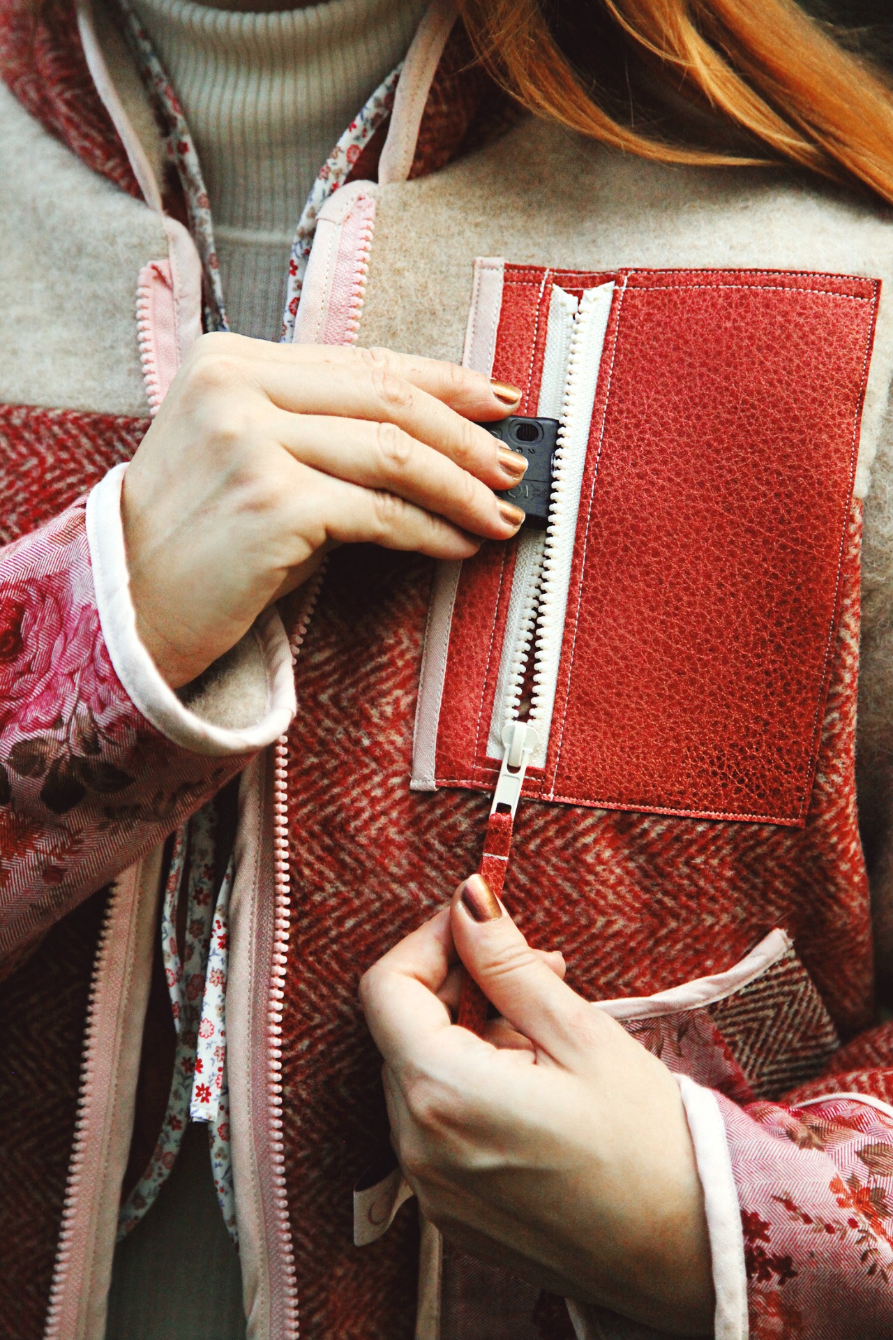 Z jedné strany je výrazná - balkánská vzorovaná vlna, kapsička z kůže a barevné zipy